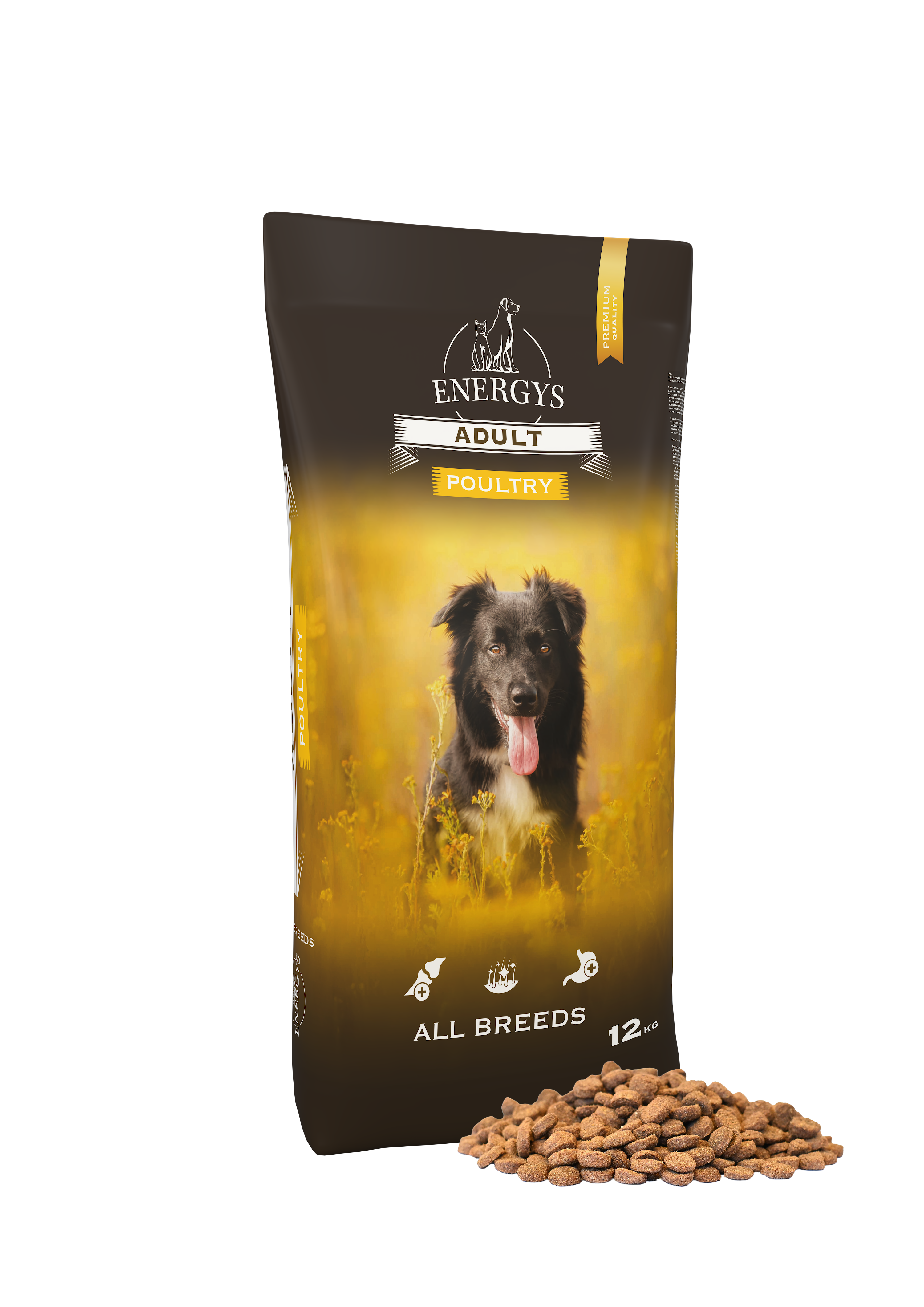 28 % sušená hydina, pšenica, kukurica, pšeničné otruby (zdroj vlákniny), hydinový tuk 6 %, pšeničná múka, 2 % sušené repné rezky, hydrolizovaný hydinový proteín, minerálne látky, inulín 0,5 % (zdroj fruktooligosacharidov), 0,5 % yucca schidigera, chondroitín sulfát 270 mg/kg, glukosamín chlorid 200 mg/kg.